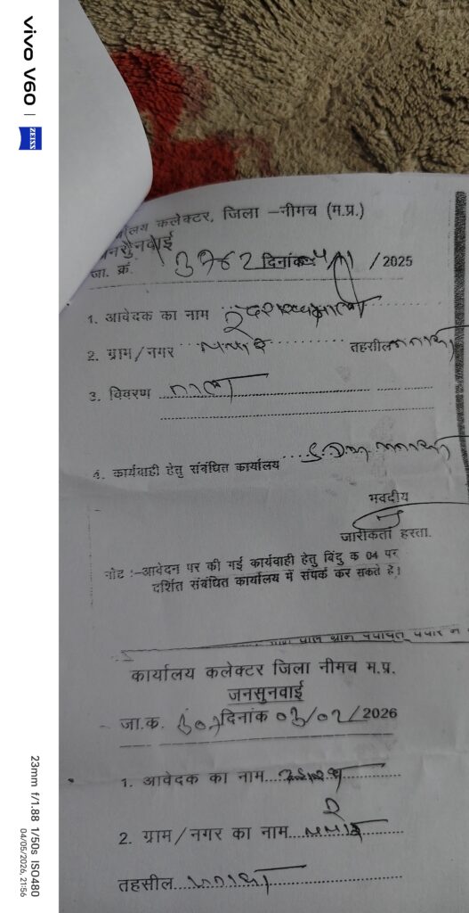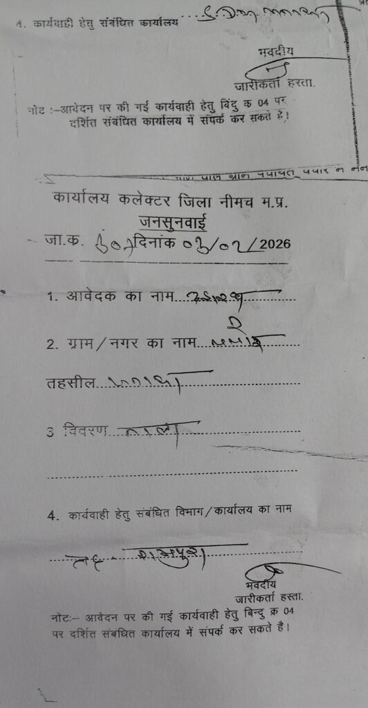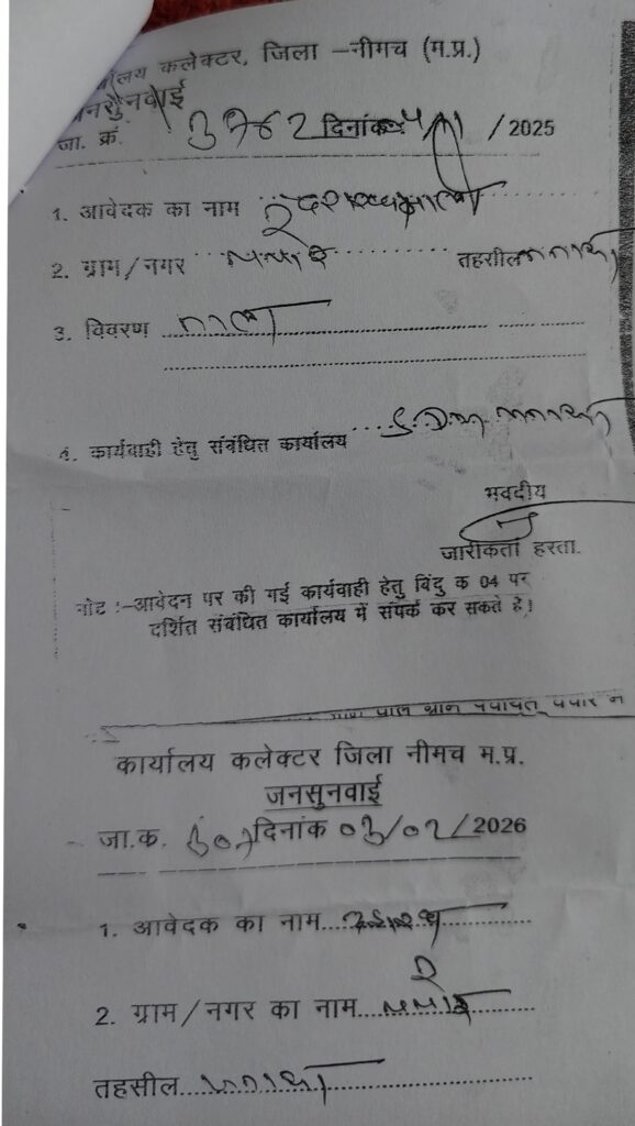 भ्रष्टाचार की चपेट में पंचायत विभाग नहीं हो रहा नाला ओपन शिकायत का दौर जारी जनसुनवाई में कई बार आवेदन के बाद भी नहीं हो रहा समाधान मंगलवार जनसुनवाई में आमजन के साथ नहीं हो रहा न्याय जनसुनवाई में सिर्फ और सिर्फ फॉर्मेटी निभाई जा रही है, नीमच जिले की आम जनता को सिर्फ गुमराह किया जा रहा है एक ही व्यक्ति को शिकायत के लिए जनसुनवाई में 1 नवंबर 2025 से आज तक लगभग 8 से 10 बार जाने के बाद भी शिकायतकर्ता की शिकायत सही पाई जाती हैं फिर भी जिम्मेदार ग्राम पंचायत जनपद पंचायत जिला जनपद पंचायत में बैठे जिम्मेदार अधिकारीयों के पास शिकायती आवेदन जाने के बाद भी नजर अंदाज कर रहे हैं! कलेक्टर व जनपद सीईओ अमन वैष्णव द्वारा कई बार देखे गए शिकायती आवेदन के बाद भी नहीं हो रहा शिकायत पर कोई समाधान, संबंधित पंचायत के पीसीओ के बदले बदले से तेवर बताते हैं हम चद्दर सेट का कब्जा हटा रहे हैं! नाले से आपको क्या लेना देना जबकि मामला जल निकासी का और यहां आकर वह अपना पल्ला झाड़ने नजर आ रहे जी हां हम बात कर रहे हैं रामपुरा तहसील के अंतर्गत आने वाली ग्राम पंचायत चचोर की जहां स्थानीय निवासी द्वारा जहाँ तीन तीन नाले आपस में मिलकर एक बड़े नाले का रूप ले लेता है हैं उस जगह के नाले पर कब्जा कर छोटे पाइप डाल बंद कर ऊपर टीन सेट उतार कर नाले की निकासी कम कर दी गई तत्पश्चात शिकायत का दौर पिछले पांच माह से रामपुरा तहसील एसडीएम मनासा व नीमच जनसुनवाई में पिछले पांच माह से संचालित हैं शिकायत पर शिकायत पर आज तक नहीं हुआ कोई समाधान ऐसा प्रतीत होता है कि नीमच जिले के प्रशासन व्यवस्था भ्रष्टाचार में लिप्त हो चुकी कब होगा आमजन के साथ न्याय या फिर इंतजार होगा बारिश का जिसमें शिकायतकर्ता के घर में बाढ़ जैसे हालात देखने के बाद कोई ठोस कदम उठाएंगे तब तक बहुत देर हो जाएगी क्यों नहीं कर रहे नाला खुला आखिर राजनीति के अभाव में या फिर भ्रष्टाचार की चपेट में आ चुके हैं जिम्मेदार ग्राम पंचायत से लेकर नीमच जिले कि जनपद पंचायत या फिर नीमच की राजनीति सक्रिय हो गईं , कब होगा नाला ओपन कब मिलेगा जल निकासी से निदान, 181 हेल्पलाइन का भी नहीं हो रहा उनके ऊपर कोई असर आखिर क्या खिचड़ी पक रही पंचायत विभाग़, के सरपंच, सचिव,पीसीओ और नाला कब्जा धारी के बीच